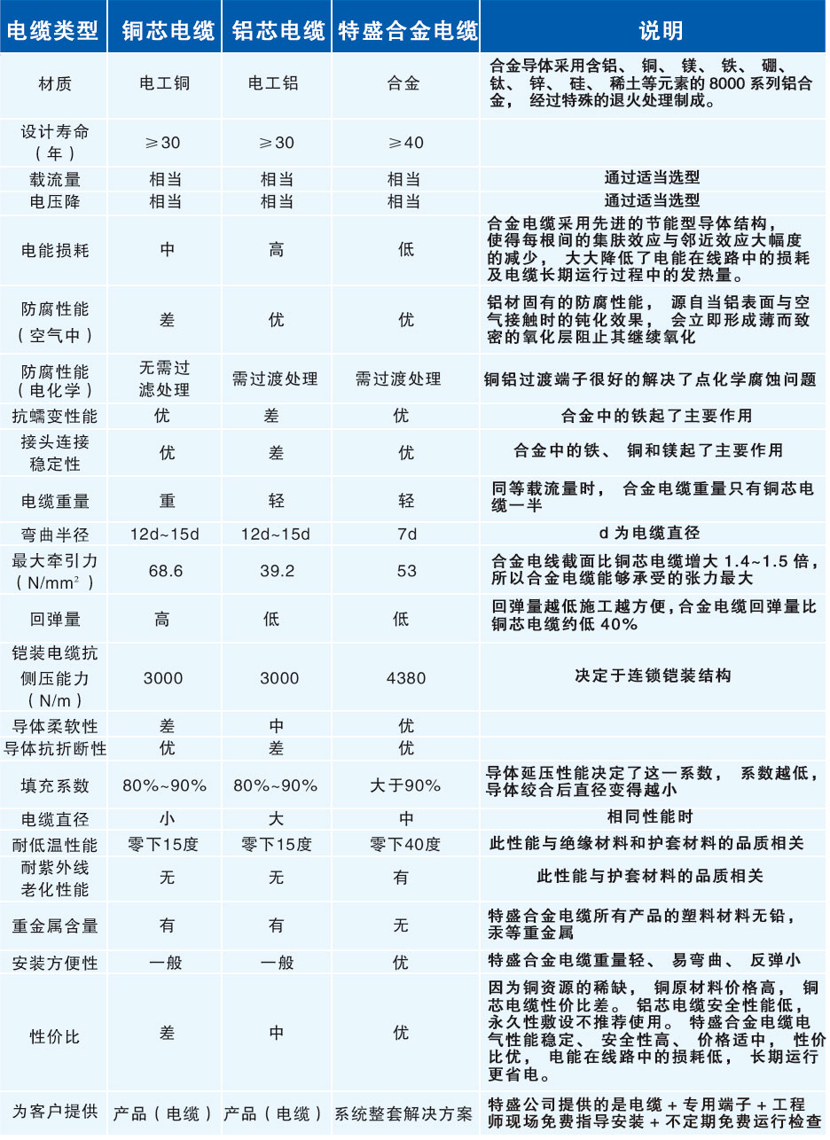 鋁合金芯電力電纜與銅或鋁芯電力電纜性能對比表