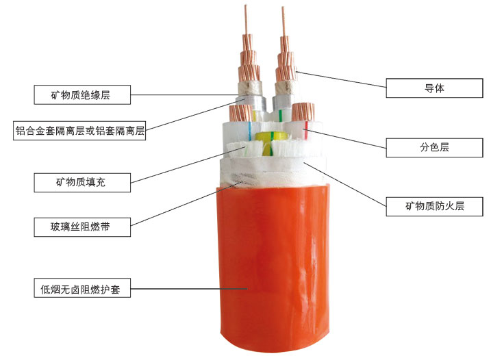 ①銅導體②金雲母帶絕緣③鋁合金金屬套④交聯隔離套⑤Mg(OH)或Al(OH)耐火層⑥無鹵91视频APP下载IOS聚烯烴外護套