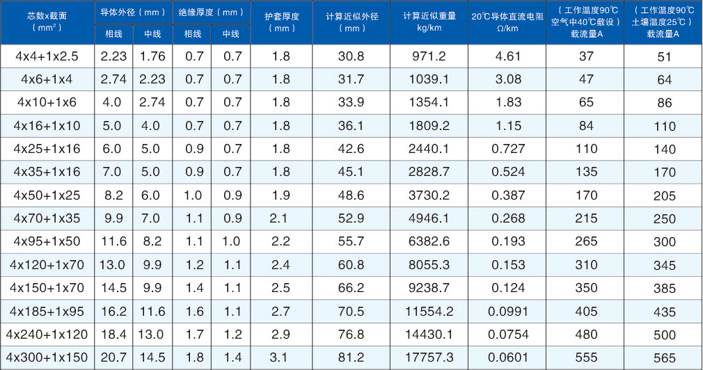 型號:NGA(BTLY) 規格:3x4+2x2.5-3x400+2x185mm2 額定電壓:0.6/1KV
